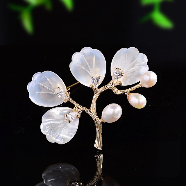 淡水パールジルコン花と枝ブローチ天然貝殻花コサージュ入学式卒業式結婚式お誕生日記念日母の日贈り物