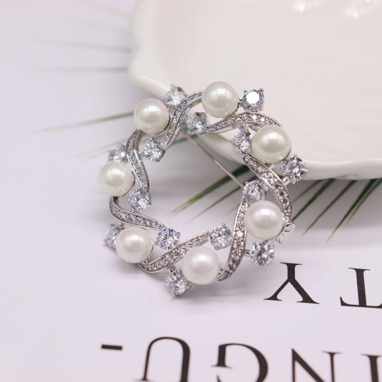 ★形: ジルコンリボン真珠花ブローチ